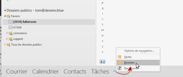 Les dossiers publics ne sont visibles que depuis la vue Dossiers, celle-ci est accessible par le bouton "..." en bas de la fenêtre Outlook :