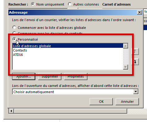 Ce sont dès lors les carnets listés dans le champ qui seront pris en compte lors de la recherche par complétion des adresses. La liste comporte par défaut la totalité des carnets, les carnets créés par la suite y seront automatiquement ajoutés par Outlook, il ne sera donc pas nécessaire de refaire la manipulation pour chaque carnet de domaine ajouté en suivant la procédure de la 1ère partie.