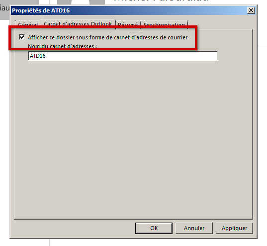 Dans la fenêtre qui s'ouvre, aller à l'onglet "Carnet d'adresses Outlook" et cocher la case "Afficher ce dossier sous forme de carnet d'adresses de courrier" :