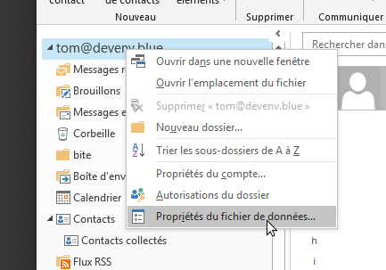De retour à la vue principale, effectuer un clic droit sur le nom du compte et choisir "Propriétés du fichier de données..." :