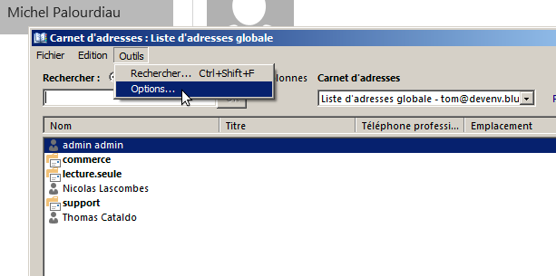 Les carnets de domaine n'apparaissent pas par défaut dans Outlook connecté en mapi, il convient de procéder à une configuration particulière sur le poste pour les voir apparaître dans l'interface et pouvoir les utiliser lors de la rédaction de messages. Pour cela, suivre la procédure décrite dans cette page.