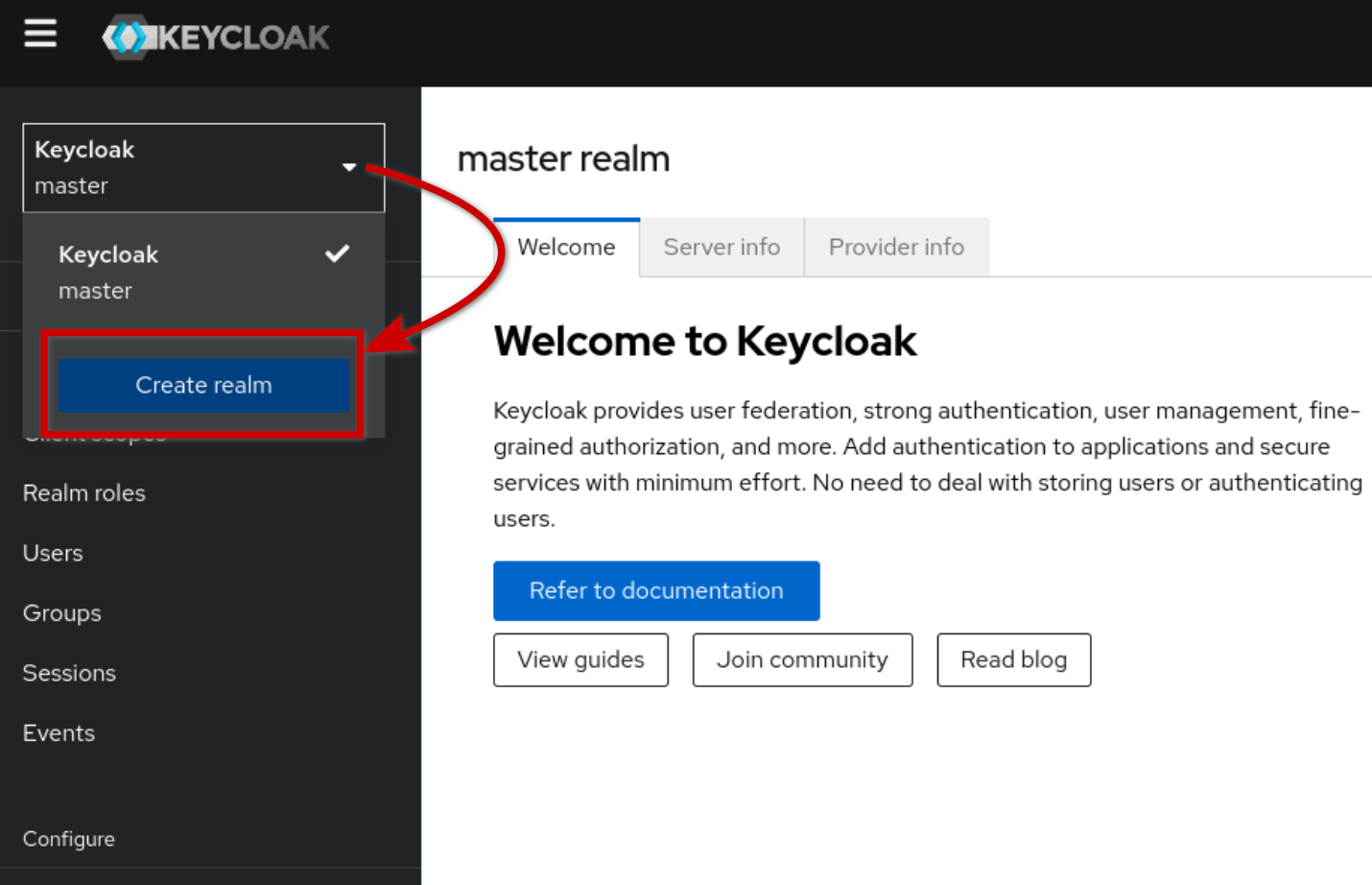 Erstellen Sie ein neues Königreich (realm) in Keycloak: Öffnen Sie die Dropdown-Liste oben links und klicken Sie auf "Create realm":
