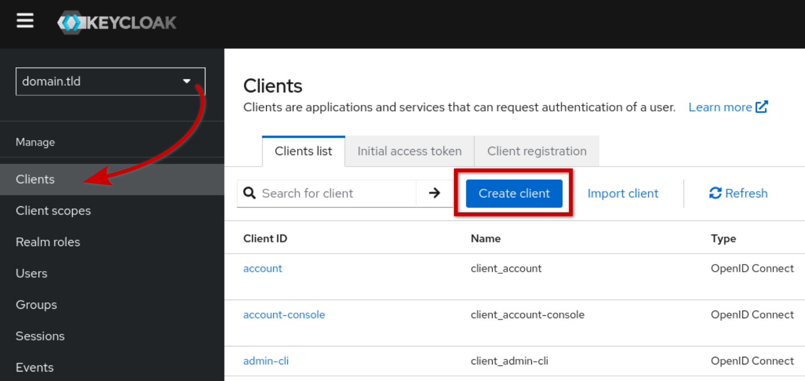OpenID-Kunde erstellen: Wählen Sie das erstellte Königreich aus und klicken Sie auf "Create" oben auf der Registerkarte "Clients list":