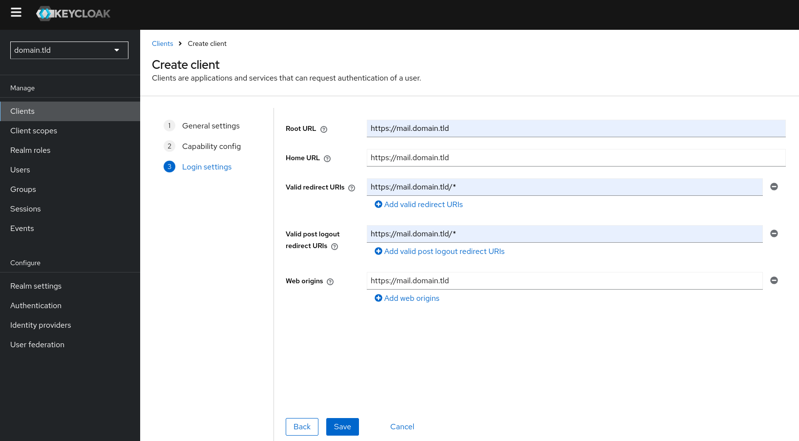 Die URL ist wie folgt formatiert: - OpenID Kundenkennung und Geheimnis des OpenID-Client: Gehen Sie zu Manage > Clients > domain.tld , gehen Sie zum Menü Action in der oberen rechten Ecke der Seite und klicken Sie auf "Download adpater config". Es öffnet sich ein Popup mit der Konfiguration, in der die gewünschten Elemente enthalten sind: