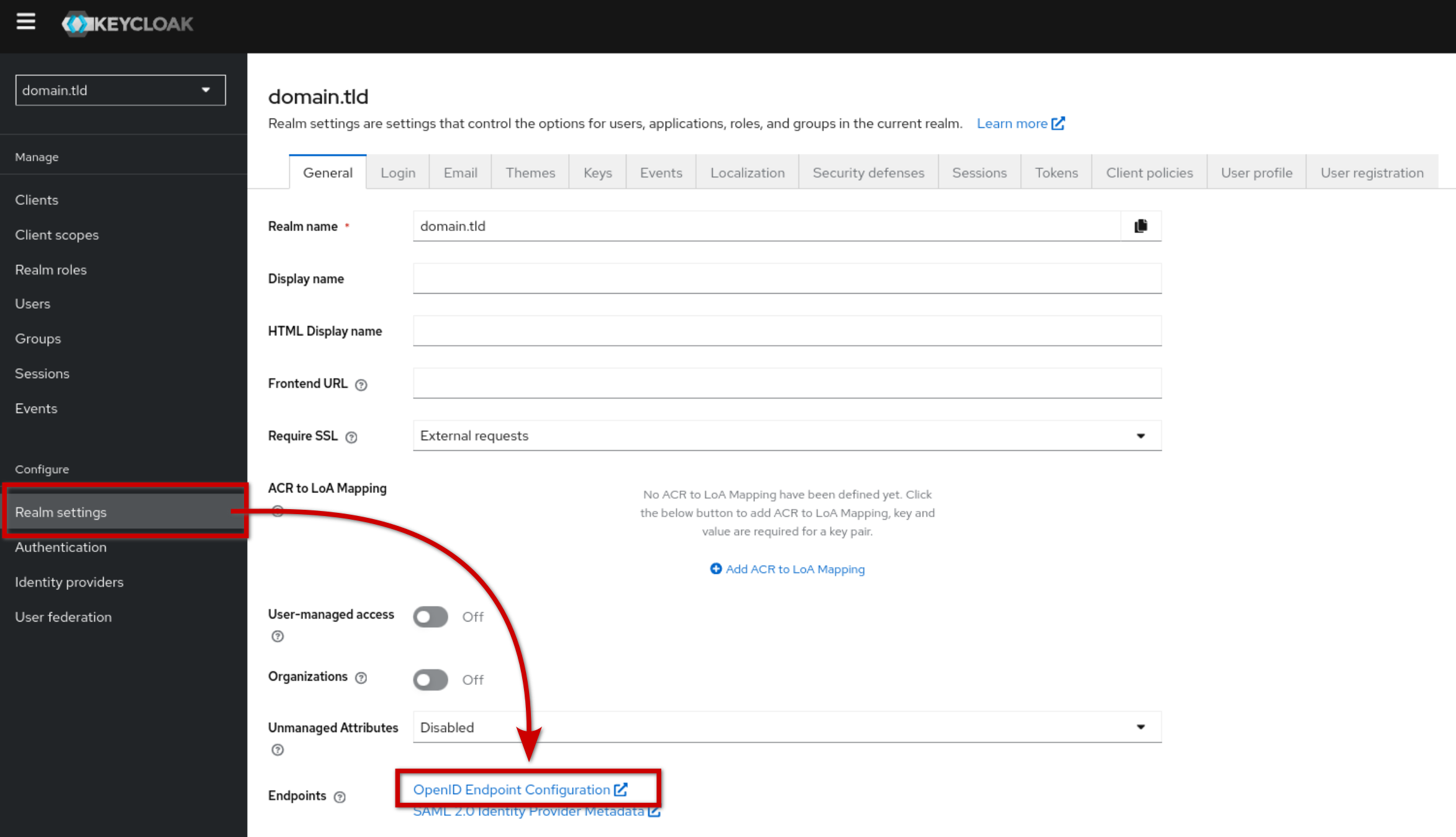 - Die URL des Drittanbieter-OpenID-Servers: Gehen Sie zu "Realm settings" und klicken Sie auf "OpenID Endpoint Configuration":