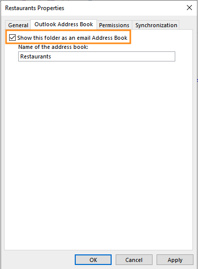 In dem geöffneten Fenster gehen Sie zum Tab "Outlook-Adressbuch" und aktivieren Sie das Kästchen "Diesen Ordner als E-Mail-Adressbuch anzeigen" :