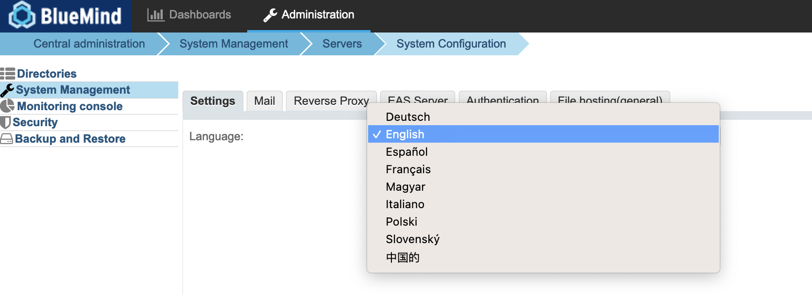 Gehen Sie dazu unter Systemverwaltung > Systemkonfiguration und wählen Sie die gewünschte Sprache im Register Einstellungen