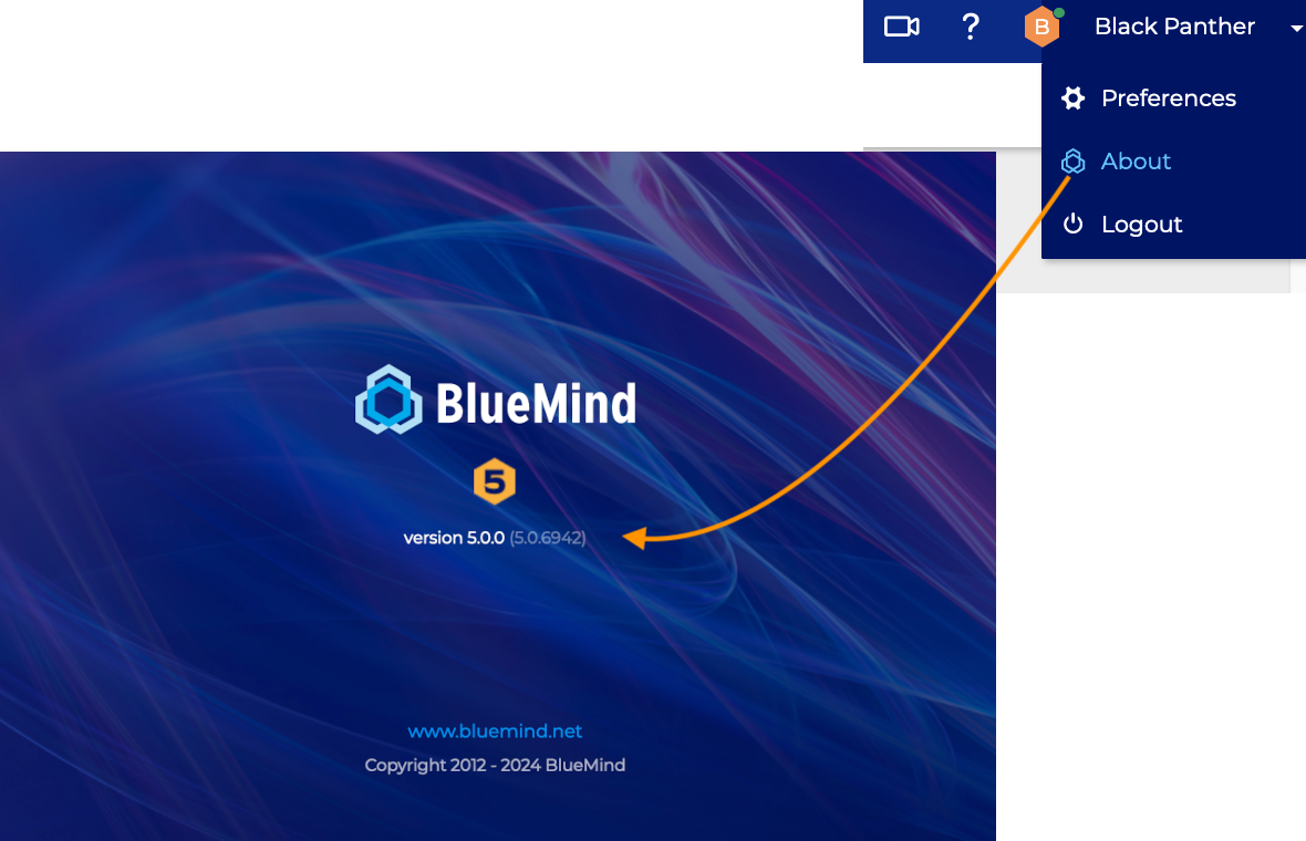 Um die technische Version zu kennen, klicken Sie nach der Anmeldung bei BlueMind auf "Über" im Menü rechts oben auf dem Banner :