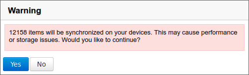 Wenn der Benutzer seine Einstellungen aufruft oder der Administrator das Verwaltungsblatt des Benutzers aufruft, wird eine Warnung angezeigt, dass eine große Anzahl von Elementen mit den Geräten synchronisiert wird, was zu Problemen führen kann: