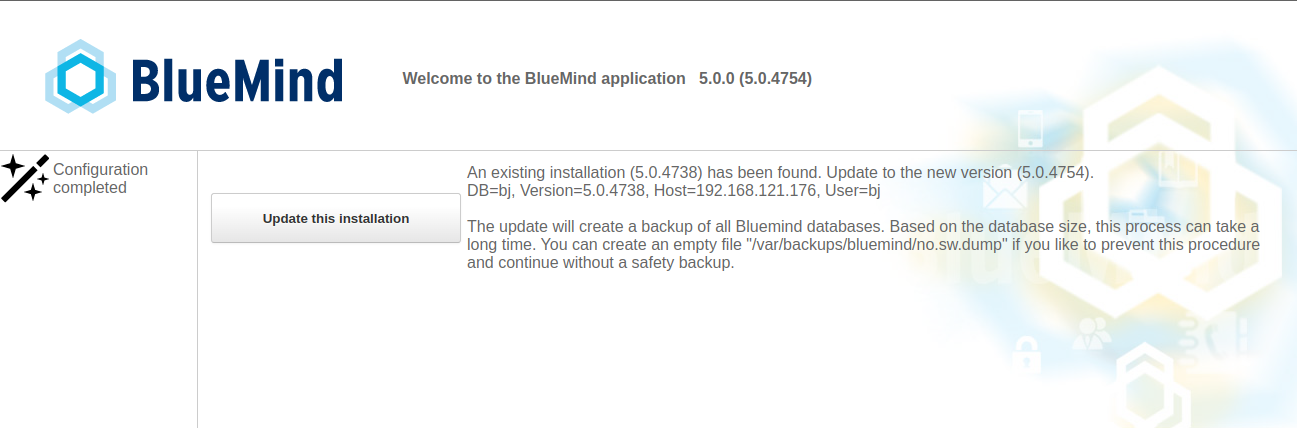 Lancer la procédure automatique de configuration de BlueMind en cliquant sur le bouton « Update this installation » ("Mettre à jour cette installation")