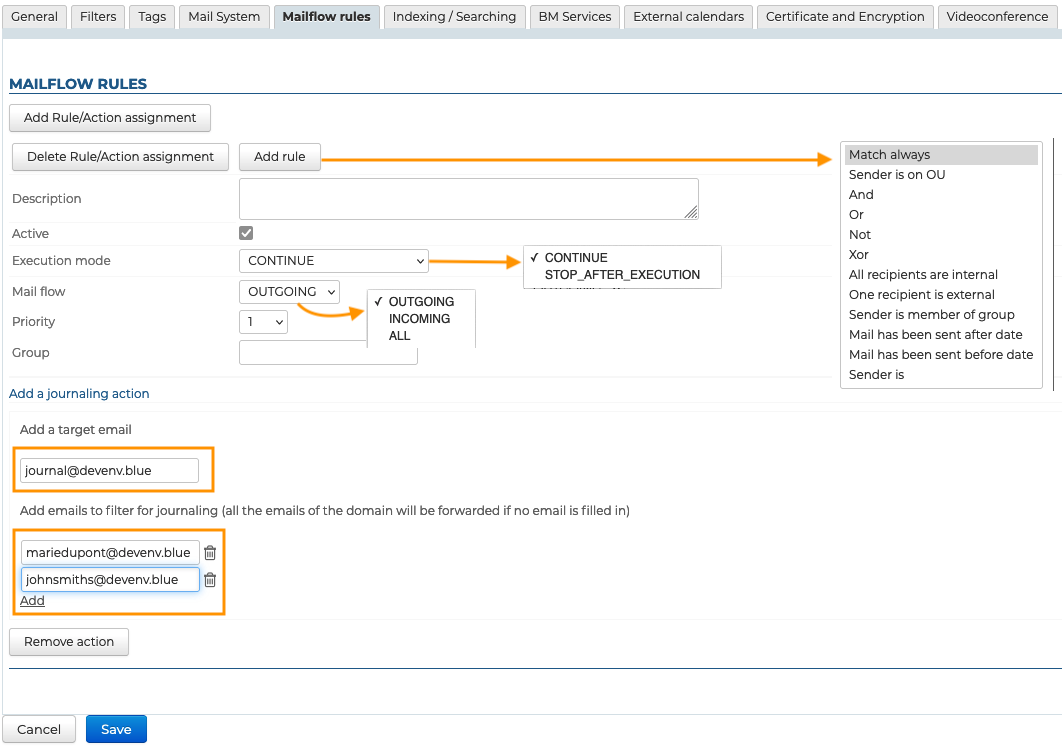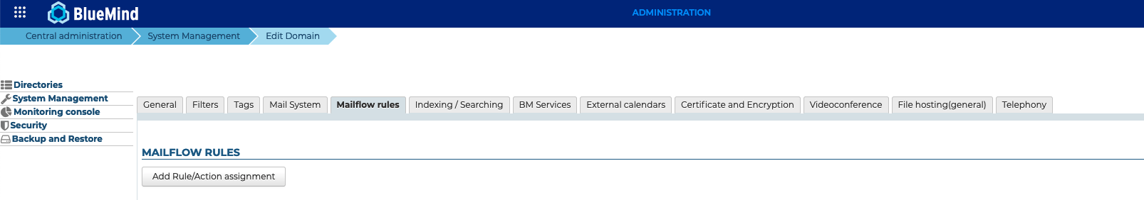 Pour configurer la Protokollierung in BlueMind, wählen Sie die gewünschte Domäne aus und gehen Sie dann auf den Tab "Mail-Flussregeln"