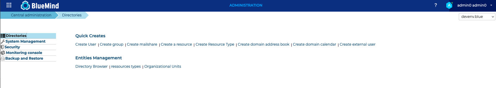 Die Erstellung und Verwaltung von Entitäten erfolgt im Abschnitt "Verzeichnisse" der Verwaltungskonsole.