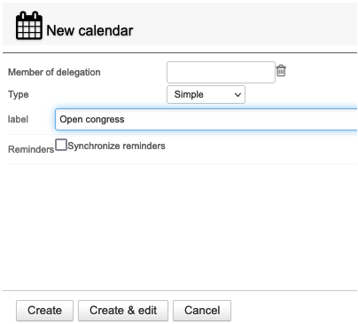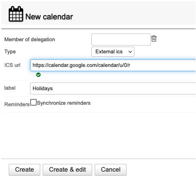 - Wenn Sie das Feld verlassen (Tabulatortaste oder Klick nach außen), wird der URL von BlueMind bestätigt. Solange die Url als ungültig angesehen wird, kann der Kalender nicht erstellt werden.
