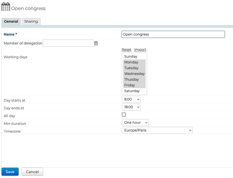 Auf dieser ersten Registerkarte der Verwaltung eines Domänenkalenders können Sie die Eigenschaften des Kalenders festlegen: Arbeitstage, Anfangs- und Endzeiten des Arbeitstages, Mindestdauer eines Termins, Zeitzone.