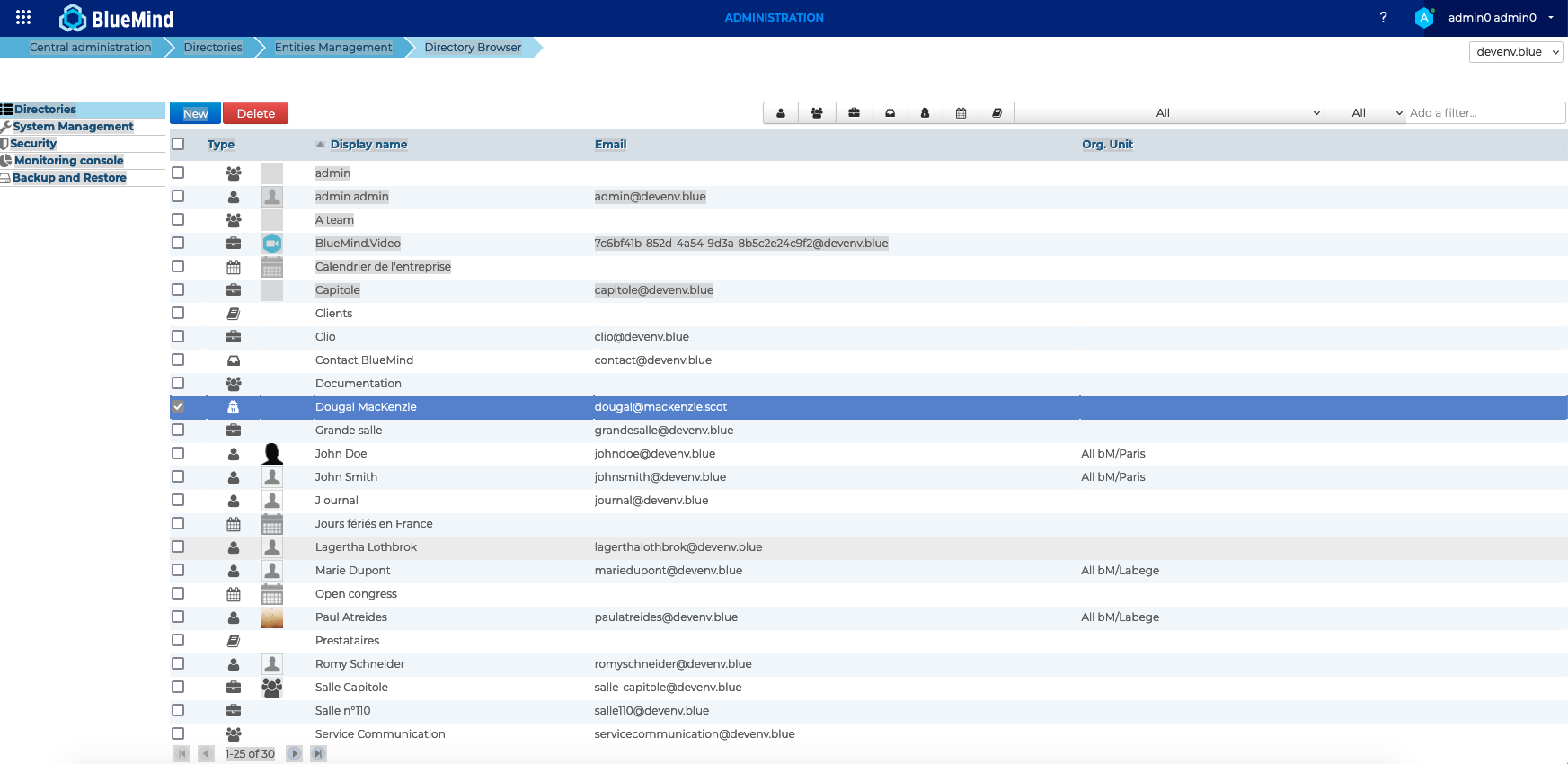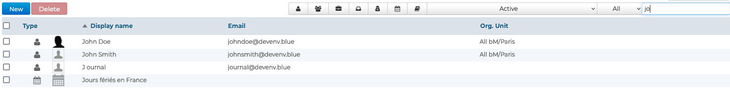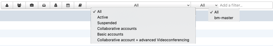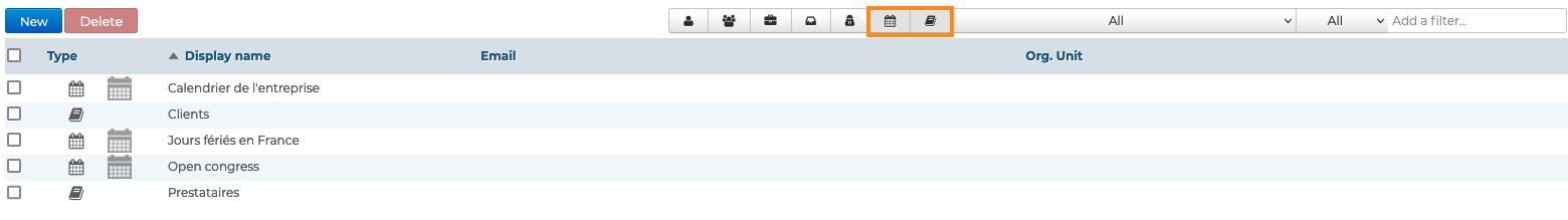 - **Die ersten 7 Schaltflächen ermöglichen es Ihnen, einen bestimmten Typ von Einträgen anzuzeigen oder auszublenden: Benutzer, Gruppen, Ressourcen, freigegebene Boxen, externe Benutzer, Kalender, Adressbücher.