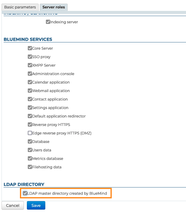 - im Abschnitt "Verzeichnisse" markieren Sie "Master-LDAP-Verzeichnis, das von BlueMind erzeugt wurde":