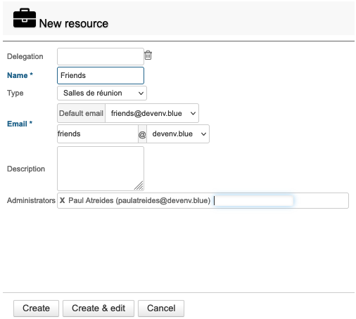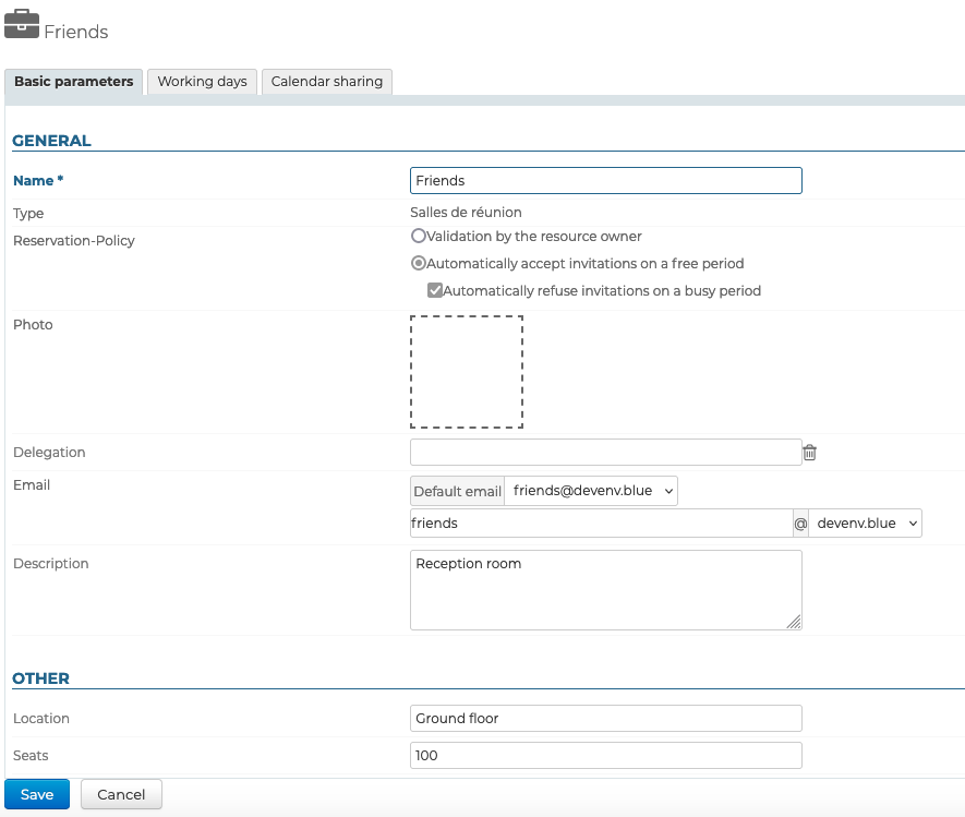 Auf der Bearbeitungsseite können Sie die allgemeinen Informationen der Ressource bearbeiten (Name, Foto, Delegation, E-Mail-Adresse, Beschreibung):