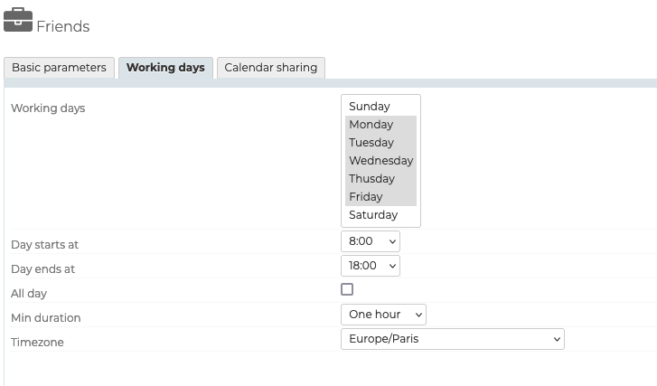 Auf der Registerkarte "Arbeitstage" können Sie die Tage und Uhrzeiten festlegen, an denen die Ressource verfügbar ist, sowie die Mindestdauer, für die sie gebucht werden kann (1 Stunde, 2 Stunden, halber Tag, ganzer Tag) und die Zeitzone: