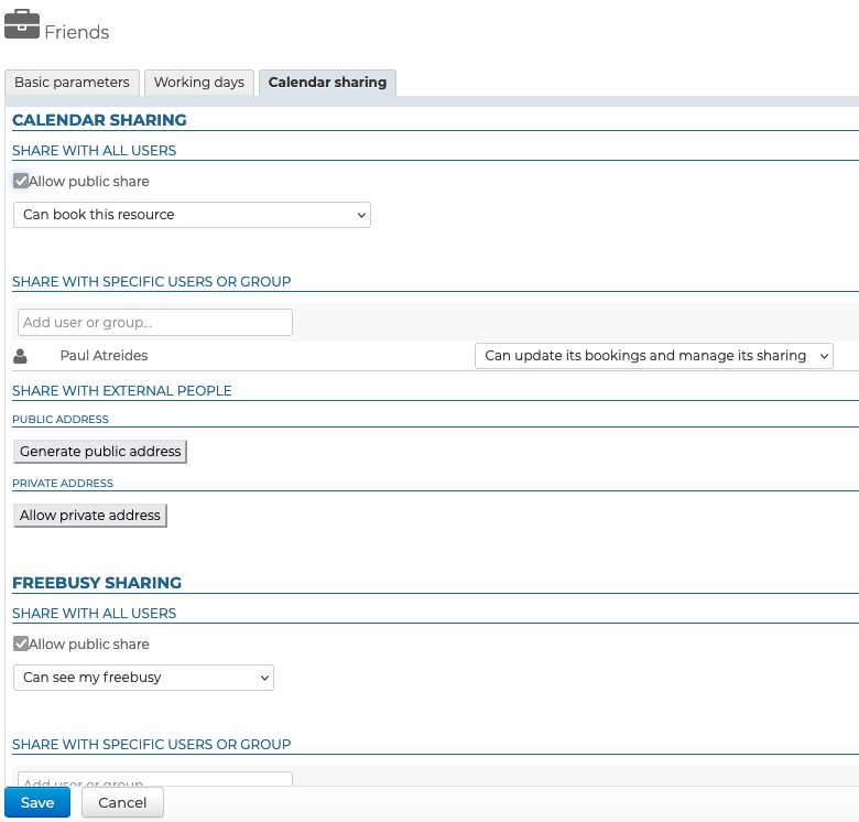 Der Reiter "Freigabe" ermöglicht es, diese Freigabe (auch "öffentliche Freigabe" genannt) zu bearbeiten und Nutzern oder Gruppen zusätzliche Rechte zu geben (z. B. einen Verwalter entfernen oder neu ernennen, das Recht, den Kalender anzusehen, nur bestimmten Nutzern geben usw.). :