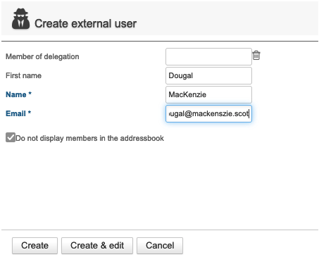 - Klicken Sie auf „Erstellen“ für eine einfache und direkte Benutzererstellung oder auf „Erstellen & Bearbeiten“, um den externen Benutzer zu erstellen und auf die Konfigurationsoptionen zuzugreifen.