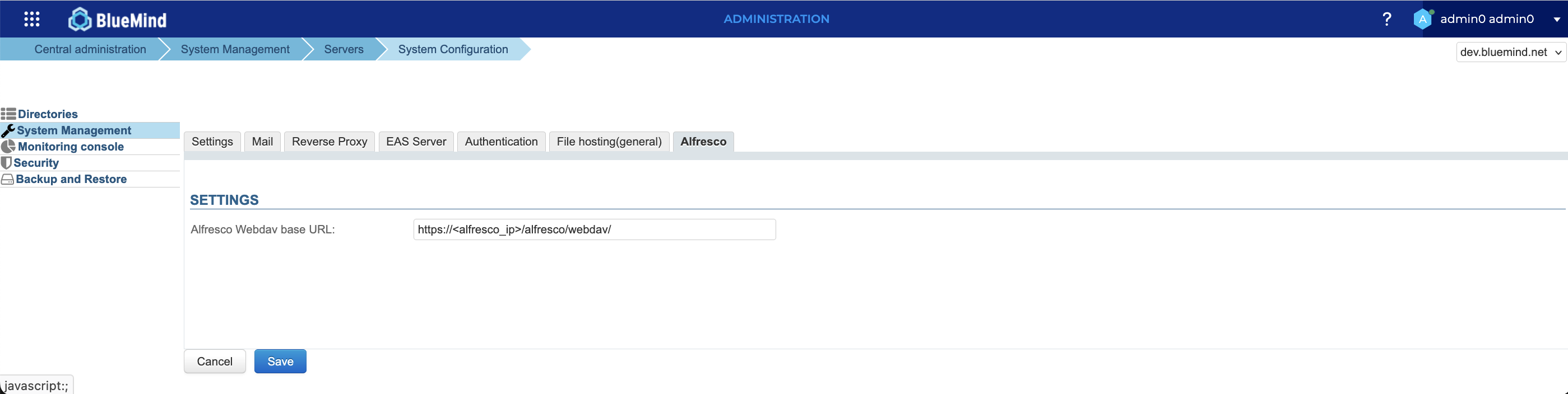 Die Verbindung von BlueMind mit Alfresco für alle Domänen erfolgt über die Systemkonfiguration der Verwaltungskonsole: