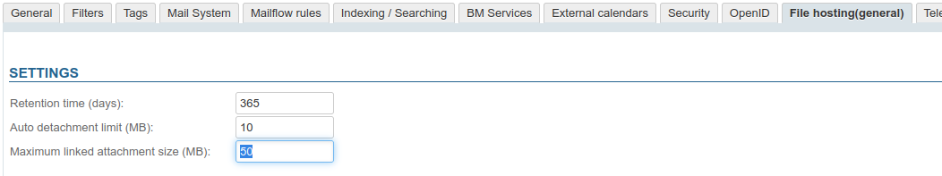 - Maximale Größe für abgelöste Anhänge (MiB1) : Maximale akzeptierte Größe für eine Datei