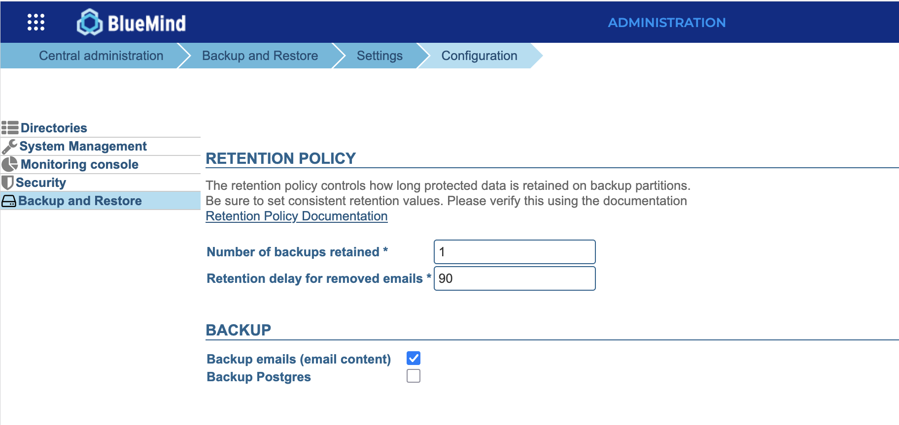 Die Verwaltungskonsole ermöglicht es, eine Backup-Politik zu implementieren. Gehen Sie dazu in die BlueMind Verwaltung > Datensicherung und Wiederherstellung > Konfiguration :
