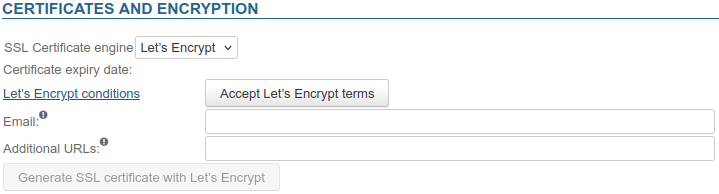 no-reply@<default-domain>verwendet. Bei Multi-Domain-Nachrichten (Shared Server) muss eine Standarddomäne definiert werden im Voraus. - Zusätzliche URLs: Geben Sie die Domänen an, für die das Zertifikat generiert werden soll zusätzlich zu den externen URLs und anderen URLs, die in Allgemeine Konfiguration für jede Domäne der Installation angegeben sind.