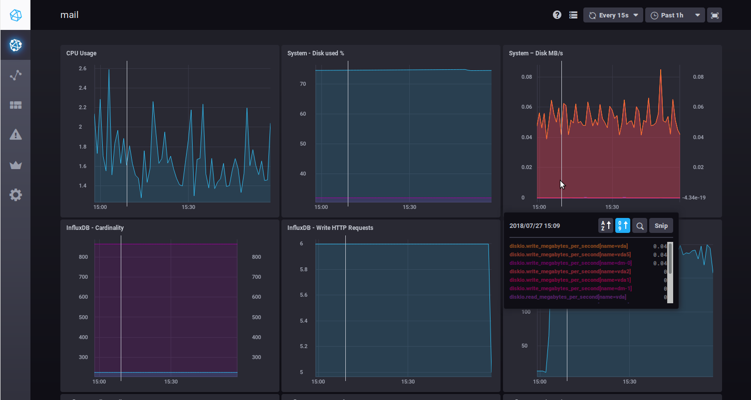 Das von BlueMind verwendete Überwachungswerkzeug Tick ermöglicht es Ihnen, alle Serverdaten in Echtzeit zu überwachen und dank der Speicherung in einer Datenbank auch die Historie der Daten einzusehen. Es ermöglicht auch eine feine und individuelle Einstellung der Warnungen in verschiedenen Formen: Warnung in der Schnittstelle, Aktion in der Befehlszeile, Schreiben in eine spezielle Log-Datei, etc.
