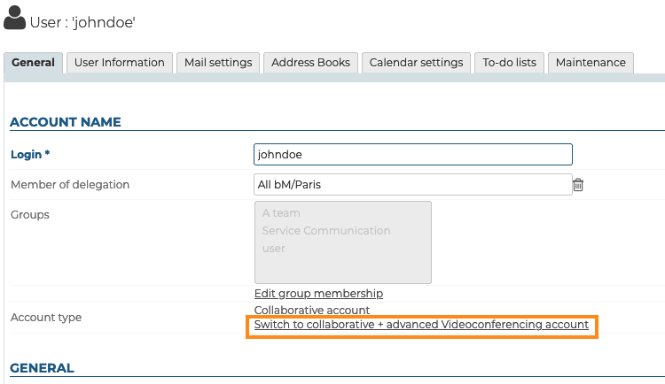 Das Profil "Kollaborativ + Visio" kann Benutzern der Domäne zugewiesen werden, sobald die Domainkonfiguration dies zulässt (siehe oben), entweder bei ihrer Erstellung oder beim Zugriff auf ihre Verwaltungsdaten in der Admin-Konsole > Tab Allgemein > Abschnitt "Kontoinformationen" :