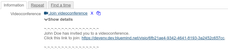 Wenn ein Benutzer eine Videokonferenz zu seinem Ereignis hinzufügt, wird das Muster automatisch im Ereignis und in der Einladungs-E-Mail an die Teilnehmer hinzugefügt:
