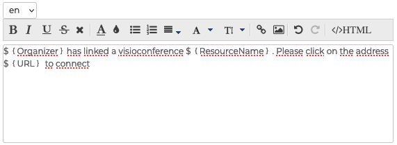 Der Vorlageninhalt kann Variablen enthalten, die automatisch im System in der Vorlage ersetzt werden:${NomRessource}: der Name der Ressource, wie im Verzeichnis definiert (Standardmäßig "Jitsi")${Organisateur}: der Name der Person, die das Ereignis im Kalender erstellt${URL}: die URL für den Zugriff auf die Konferenz