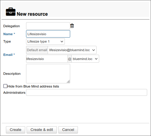 Für dieses, gehen Sie zur Verwaltung des Verzeichnisses in der Administrationsoberfläche und erstellen Sie eine Ressource vom Typ Lifesize Typ 1 :