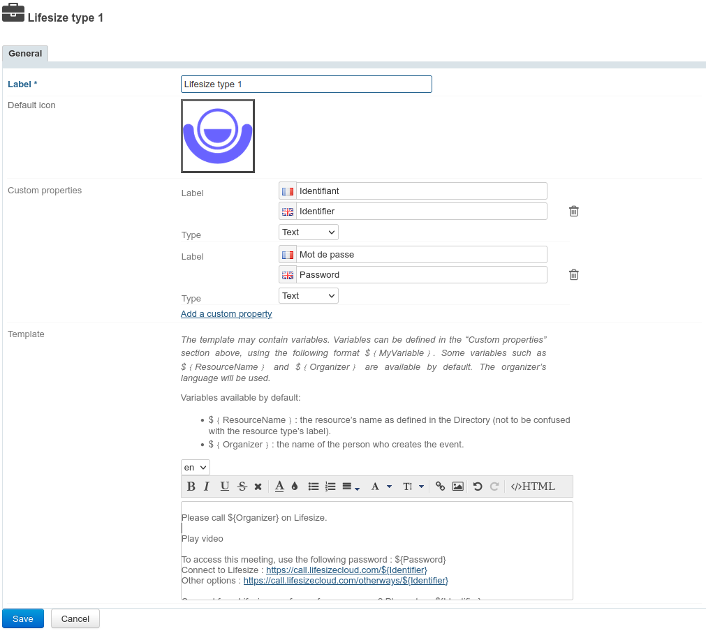 ${NomRessource}: der Name der Ressource, wie im Verzeichnis definiert (Standardmäßig "Jitsi")${Organisateur}: der Name der Person, die das Ereignis im Kalender erstellt${URL}: die URL für den Zugriff auf die Konferenz