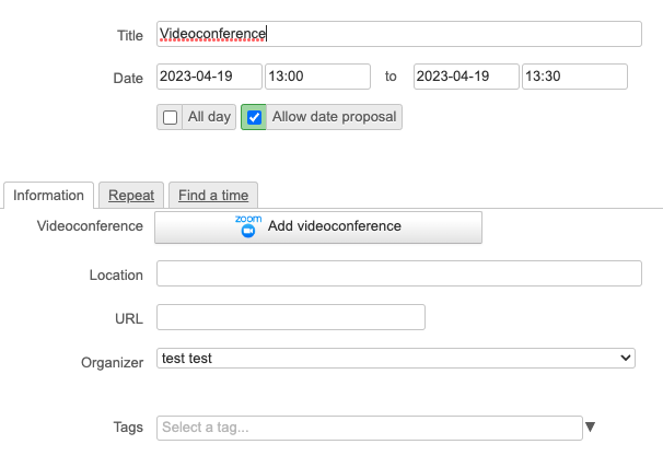 Der Zugriff auf die neue Funktion erfolgt über die Zoom-Ressource, die bei der BlueMind Konfiguration (siehe oben) erstellt wurde: