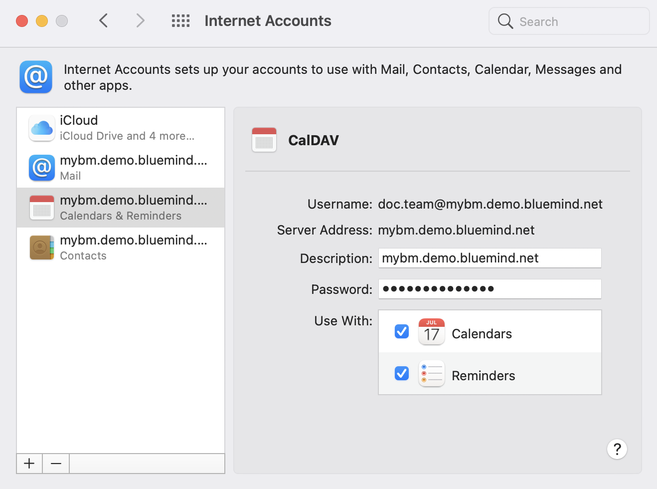 Für jede Anwendung muss ein Konto eingerichtet werden. Um alle BlueMind-Anwendungen nutzen zu können, müssen daher 3 Konten erstellt werden: Mail, Kalender und Kontakte