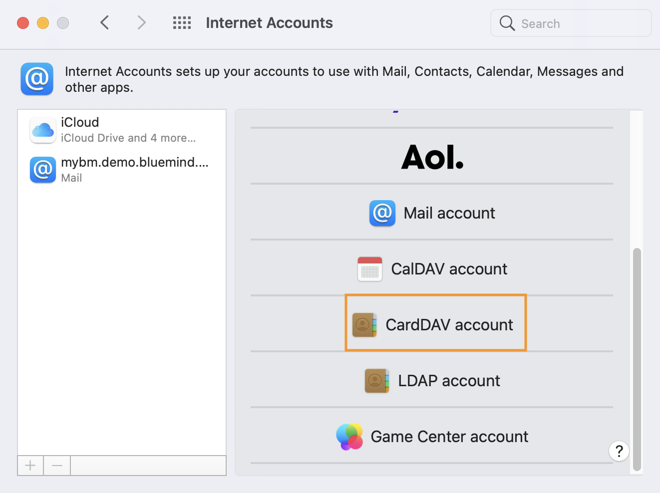 - Wählen Sie "CardDAV-Konto":