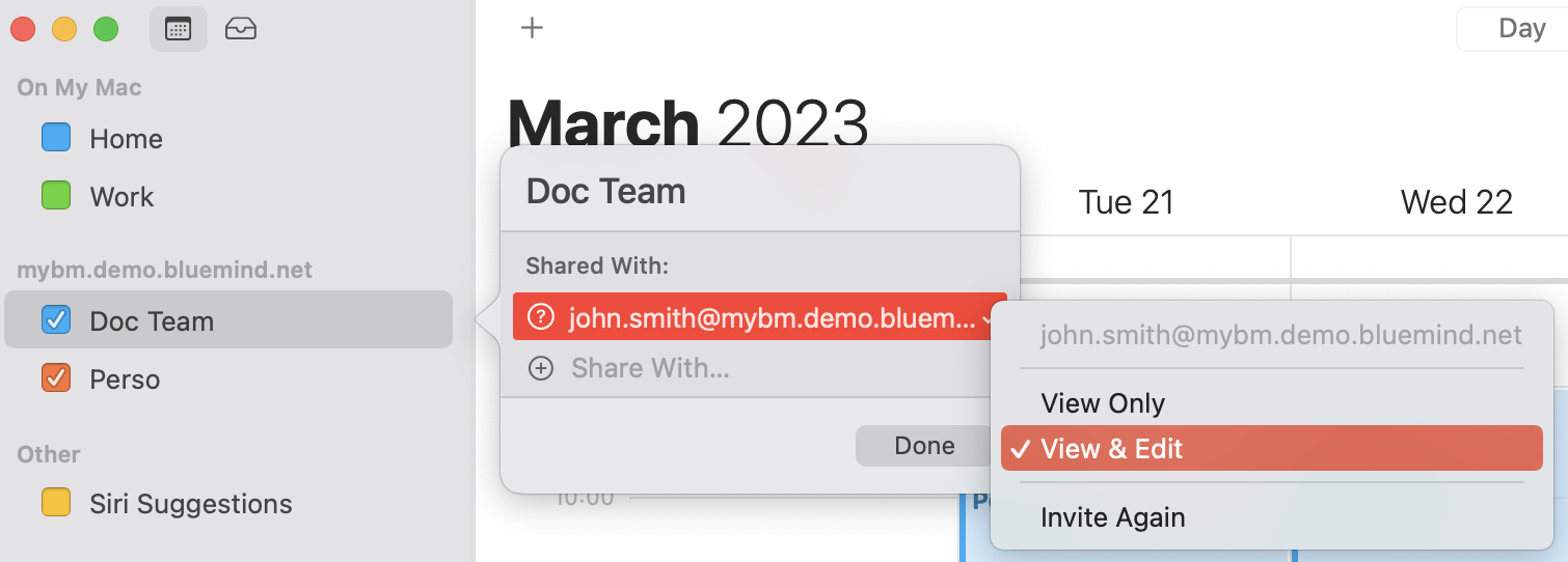 Um einen Kalender freizugeben, gehen Sie zu dem gewünschten Kalender und klicken Sie auf , wählen Sie die gewünschte Adresse aus der Liste, die durch die Autovervollständigung angeboten wird, und wählen Sie dann das Recht 'Ansehen' oder 'Bearbeiten':
