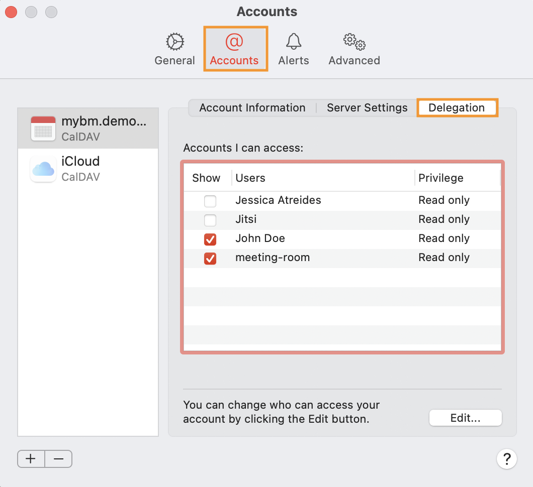 **Um einen freigegebenen Kalender hinzuzufügen, öffnen Sie die Einstellungen der Kalender-App. Gehen Sie zu Konten -> Delegation und markieren Sie die Kalender, die Sie hinzufügen möchten: