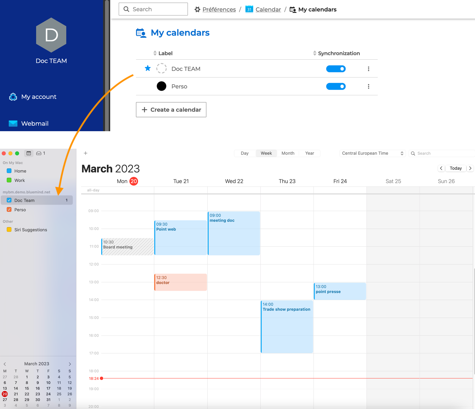 Nach dem Hinzufügen des Caldav-Kontos, erscheinen die Termine der persönlichen Kalender des Benutzers, deren Option "Synchronisation" aktiviert ist in den BlueMind Einstellungen, in der Kalender Anwendung.