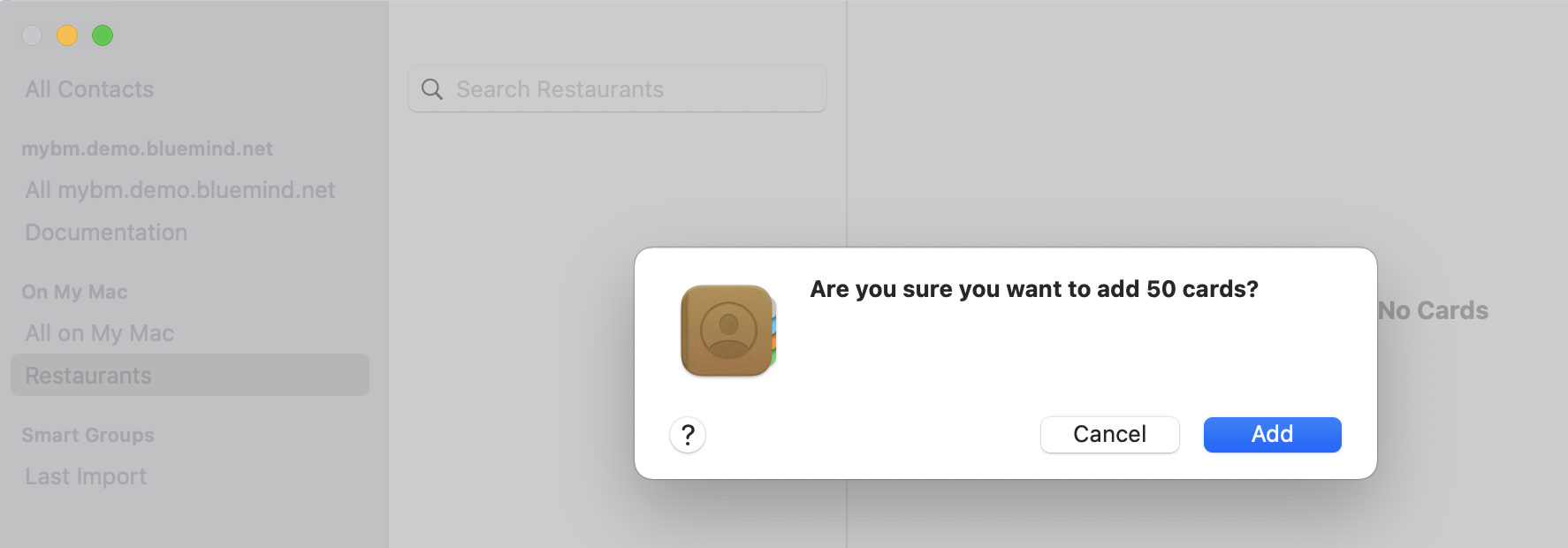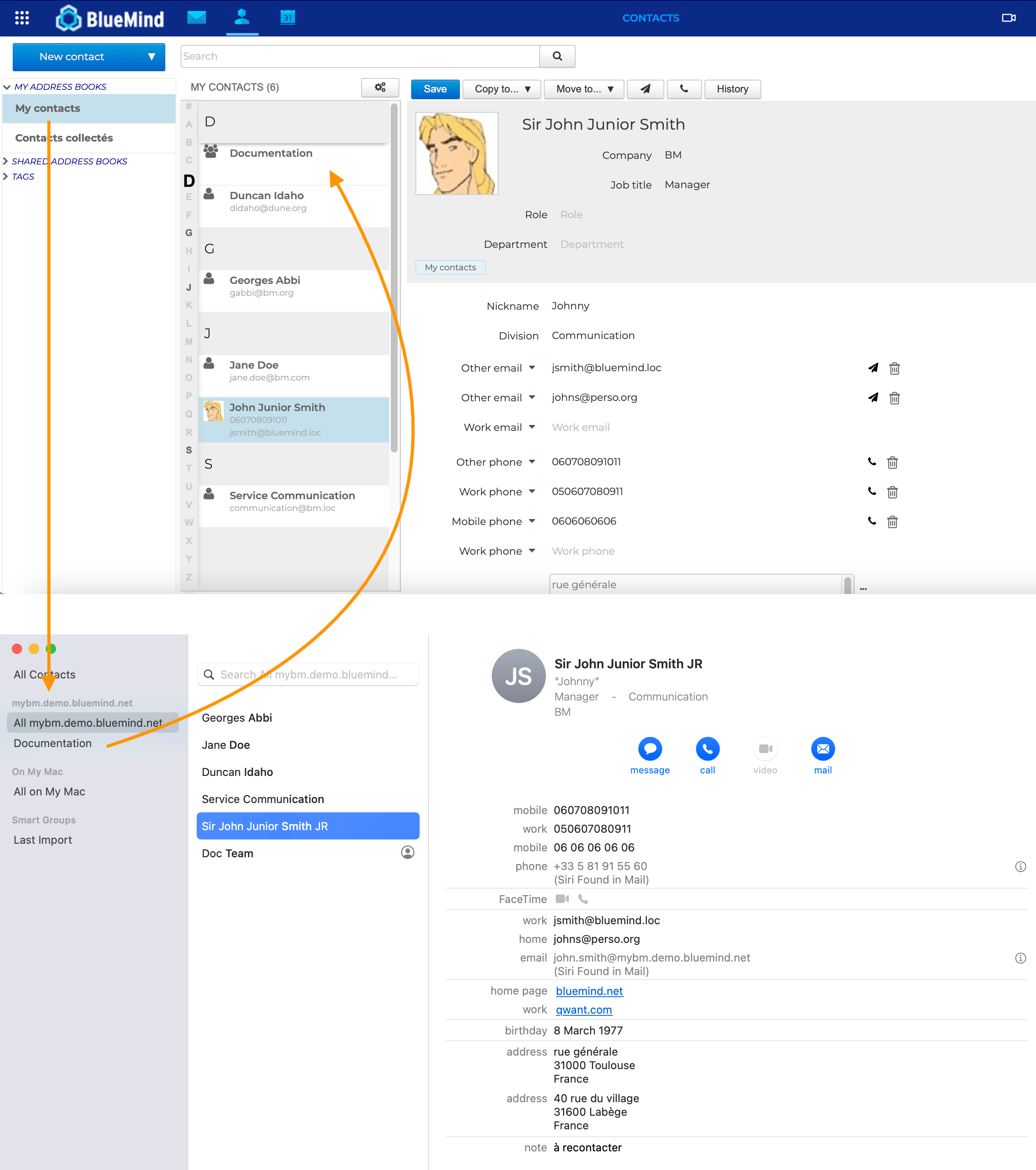 Importierte Kontakte werden nicht mit den BlueMind Adressbüchern synchronisiert. Das Ändern oder Löschen eines Kontakts auf dem Mac wird nicht in das BlueMind Adressbuch übernommen und umgekehrt.
