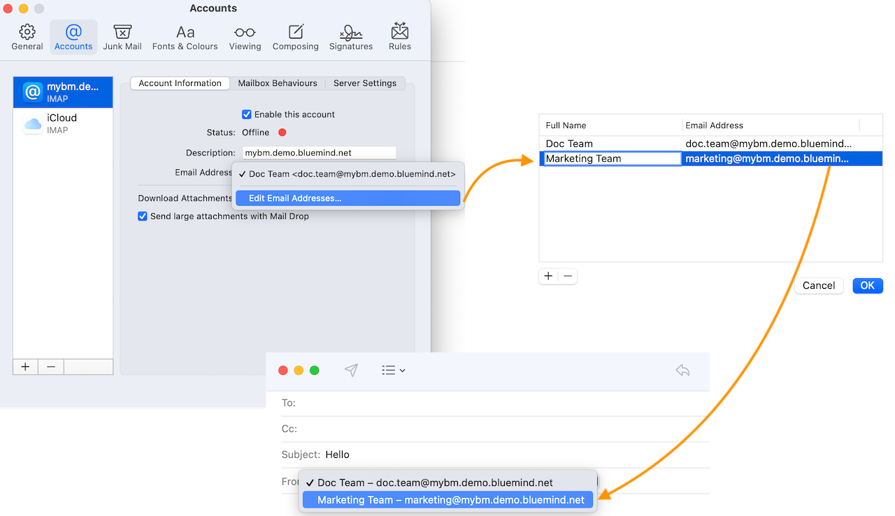 Mail verwaltet keine Lese- oder Schreibrechte für Nachrichten Sie können im Namen jeder beliebigen E-Mail-Adresse schreiben, indem Sie sie zu ihren Aliasnamen hinzufügen, unabhängig davon, ob es sich um eine freigegebene Mailbox mit Schreib- oder nur Leserechten oder um eine nicht freigegebene Mailbox handelt.