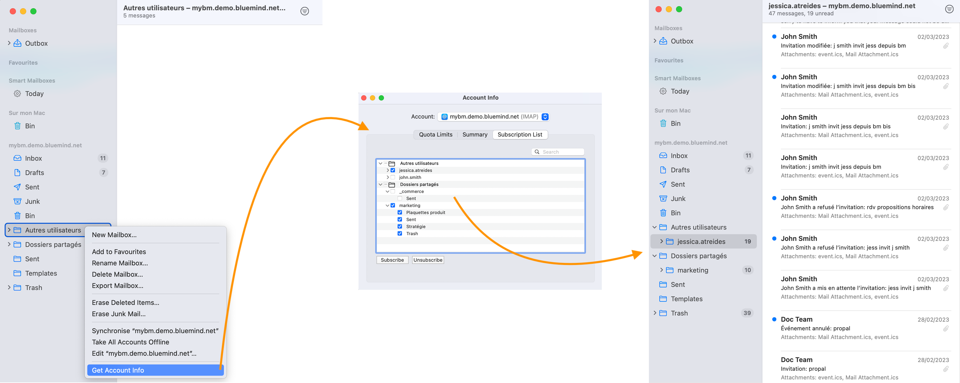 💡 Die Liste enthält alle freigegebenen Postfächer, die der Benutzer abonniert hat und deren Synchronisation aktiviert ist (siehe Eine freigegebene Mailbox abonnieren) in den Einstellungen des BlueMind Messengers.