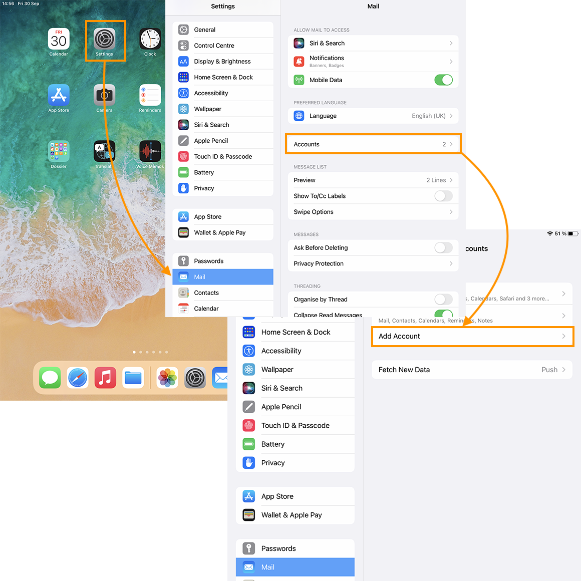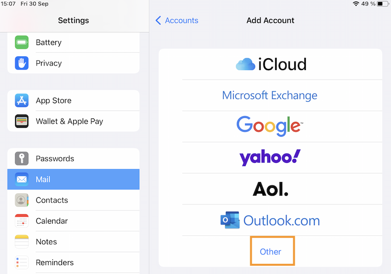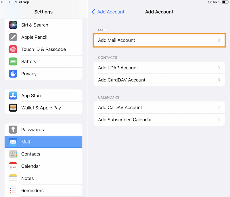 Gehen Sie in die Einstellungen des Geräts > Rubrik Mail, tippen Sie auf Konten und dann auf Konto hinzufügen: