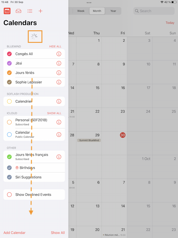 Dann erscheint das Update-Rad, das anzeigt, dass das Gerät gerade die Kalender synchronisiert. Wenn sie verschwindet und der Inhalt wieder an seinen Platz zurückkehrt, ist die Auffrischung beendet.