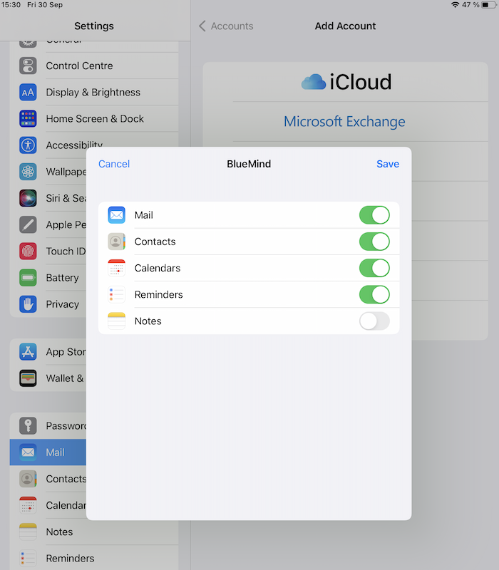 💡 Die Anwendung Notizen wird von BlueMind nicht angeboten, daher ist es nicht notwendig, die Synchronisation zu aktivieren.
