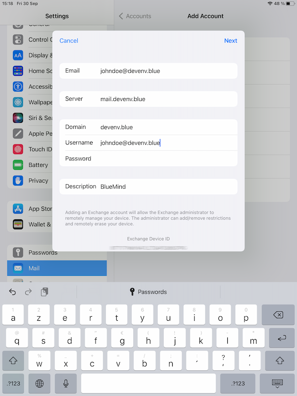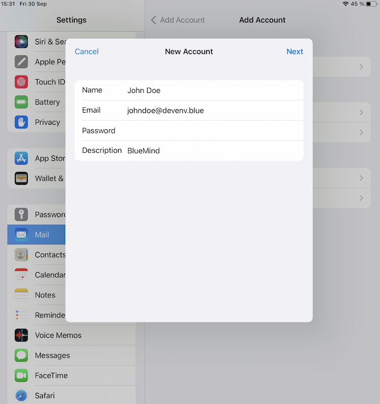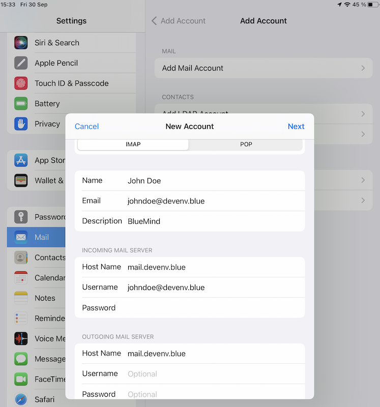 mail.devenv.blue) ist identisch mit der URL für den Zugriff auf BlueMind (indem Siehttps://entfernen). Zum Beispiel, wenn Sie über Ihren Browser auf BlueMind unter der Adressehttps://mail.devenv.bluezugreifen, geben Siemail.devenv.blueein. - Der Benutzername ist identisch mit Ihrer E-Mail-Adresse.