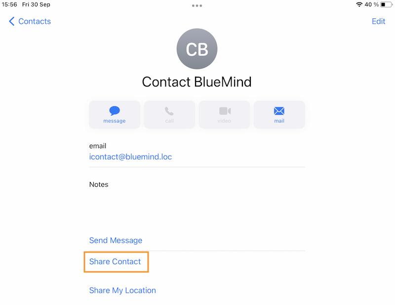 Es ist möglich, Kontakte vom iOS-Gerät in BlueMind zu importieren, um sie auf allen mit dem Konto synchronisierten Geräten (Smartphone, Web, Desktop-Client) zur Verfügung zu haben. Die Operation besteht aus einem Export/Import der Kontakte: