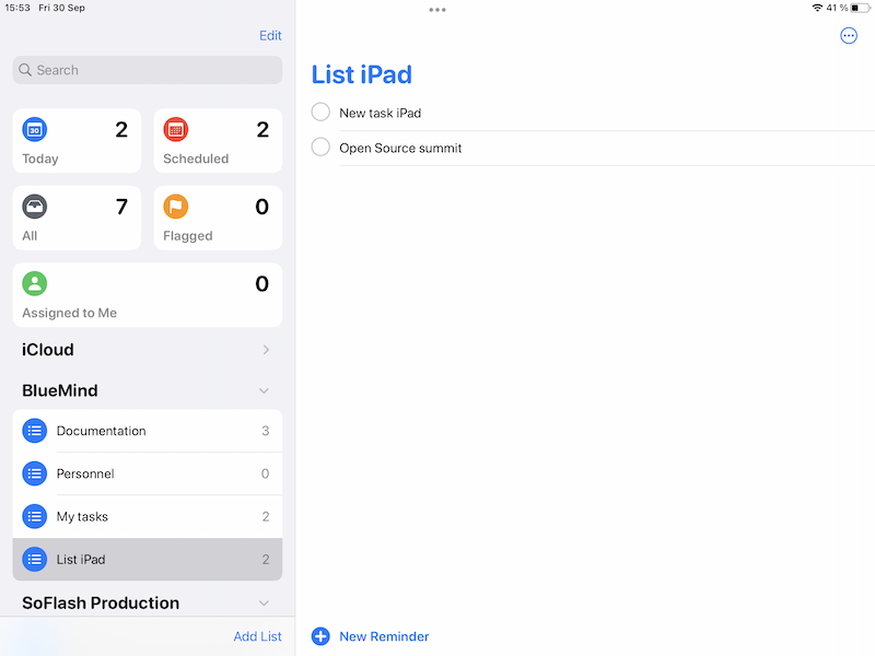 iOS ermöglicht die Synchronisierung von BlueMind-Aufgaben in der Anwendung Erinnerungen.