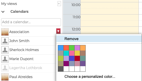 Um einen Kalender zu entfernen, klicken Sie auf das Farbsymbol neben seinem Namen und dann auf "Löschen" im angebotenen Anpassungsmenü: